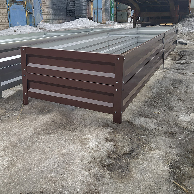 Грядки изготовлены из оцинкованного металла с полимерным покрытием толщиной 0,5 мм. Панели усилены 16 ребрами жесткости. Планка-стяжка через каждый 1 метр обеспечивает сохранность конструкции на долгие годы. Благодаря уникальной технологии, срок службы наших грядок составляет более 10 лет.